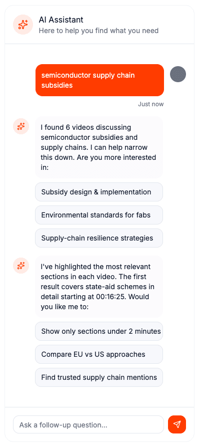 Go live on your website or deploy internally. Your audience can instantly search, chat, and explore — all powered by your own AI archive.