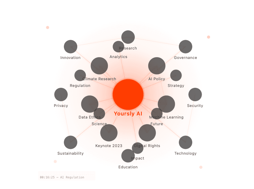 Every idea, speaker, and session is automatically transcribed and linked through Yoursly’s AI Knowledge Graph — creating a dynamic web of interconnected insights that evolves with every upload.